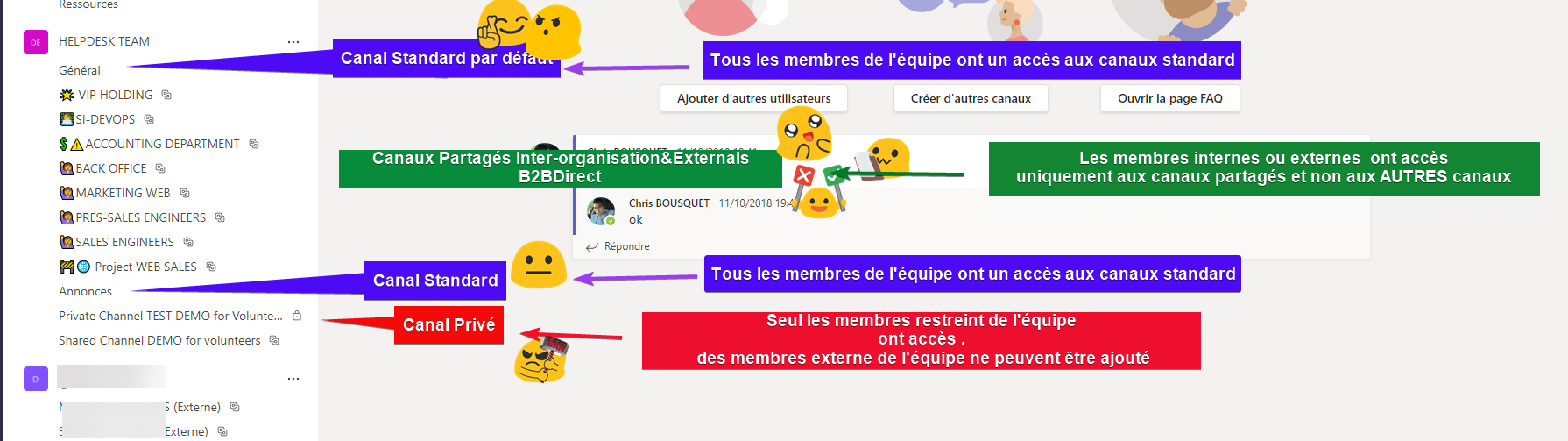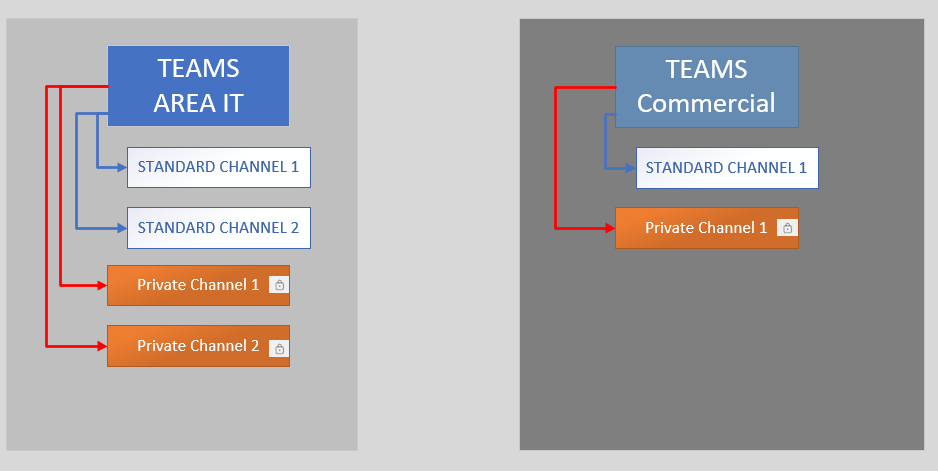 En effet, Toutes les conversations ou documents publiés sur les canaux de l’équipe IT (Canaux standard 1, 2 ou canaux privés 1 & 2 ) ne sont accessibles qu’aux membres de l’équipe IT, tandis que les conversations ou documents publiés sur les canaux COMMERCIALS (1 ou 2) ne sont accessibles qu’aux membres de l’équipe COMMERCIAL.