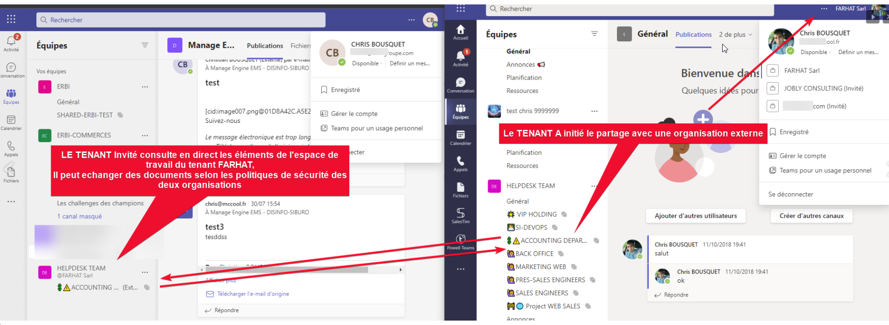Dans cet exemple, nous avons activé la collaboration bidirectionnelle par canal partagé pour tous les utilisateurs des deux organisations entre deux organisations ERBI-GROUPE et MCCOOL