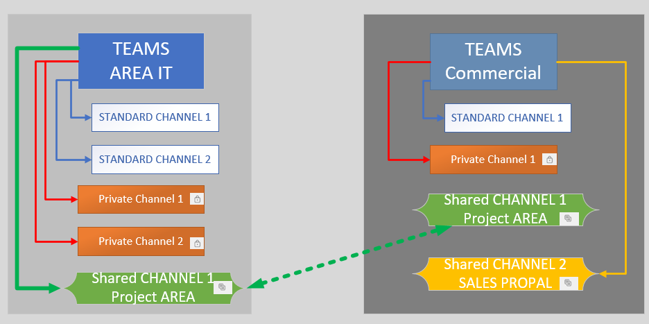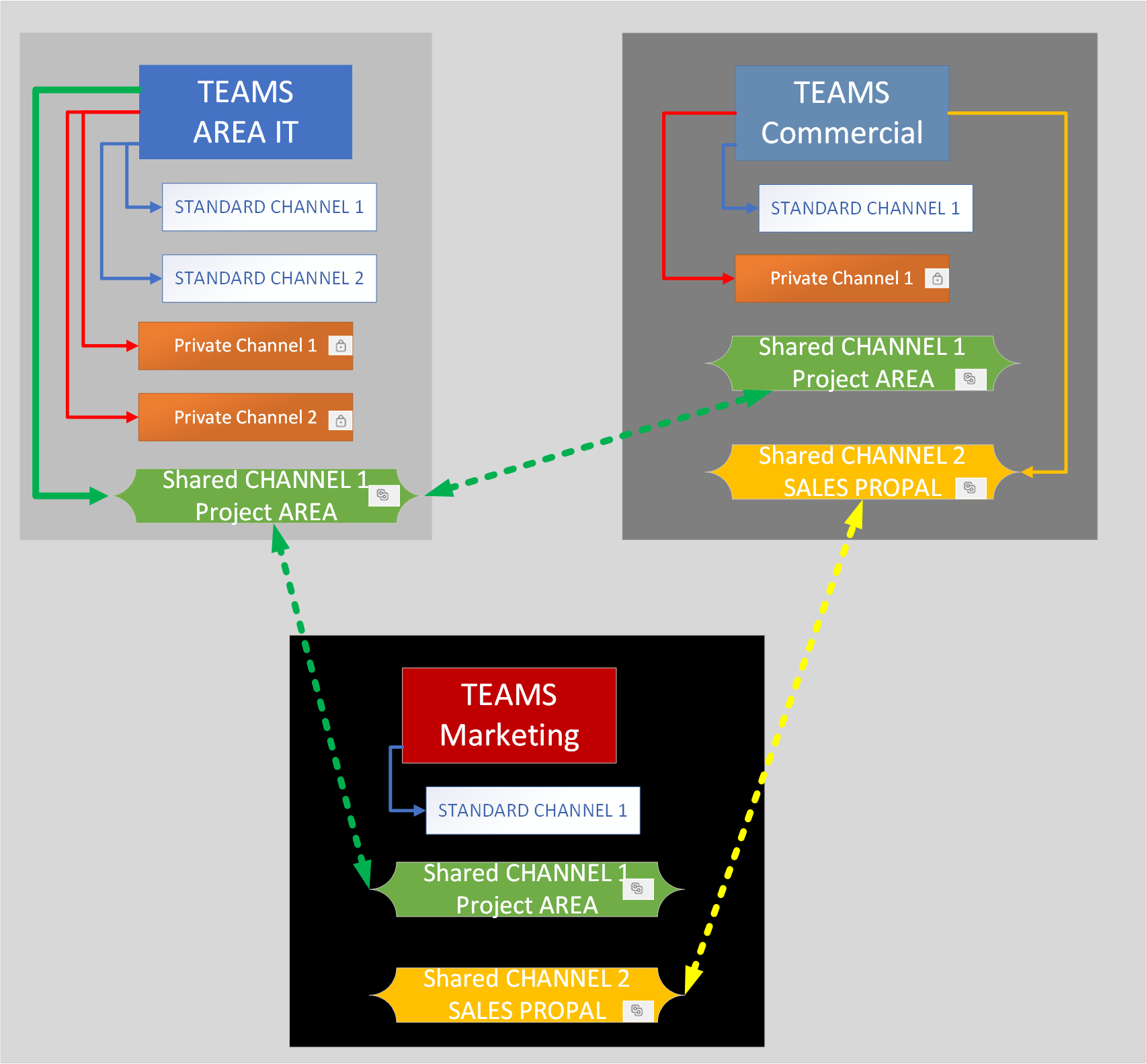Par exemple, vous créez des équipes distinctes pour l’équipe IT et l’équipe Commercial. Pour que ces équipes collaborent sur des documents à l’aide de Teams, vous deviez auparavant créer une troisième équipe distincte comprenant tous les membres de l’équipe commerciale et de l’équipe IT.