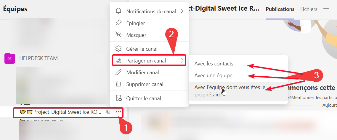 Sélectionnez “Partager le canal” dans le menu contextuel et accordez l’accès à des personnes ou à toute une équipe.