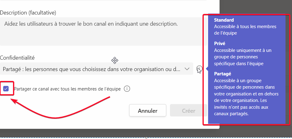 Si vous souhaitez que seuls certains membres de l’équipe aient accès au canal partagé, décochez la case “Partager avec tout le monde”.