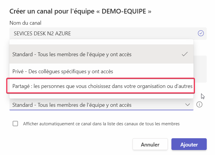 Par défaut, tous les membres de l’équipe auront accès au canal partagé.