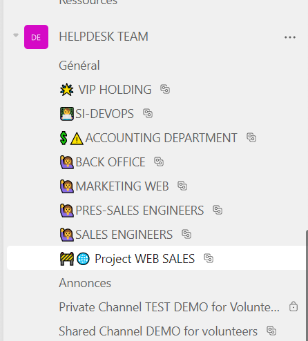 Un canal partagé est indiqué par une icône de lien tandis qu’un canal privé est marqué d’une icône de verrouillage. Un canal standard n’a pas d’icône.
