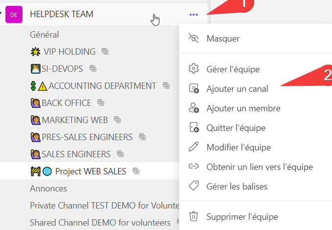 Cliquez sur les trois points à droite de n’importe quel nom d’équipe et choisissez “Ajouter un canal”.